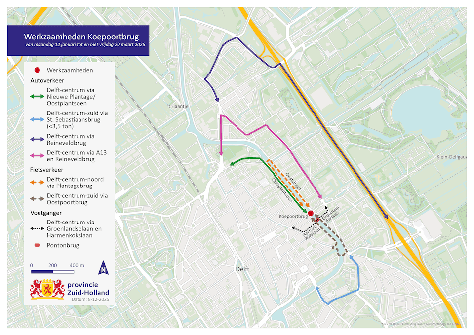 De Koepoortbrug gaat vanaf maandag 19 januari voor ruim twee maanden dicht vanwege werkzaamheden. Deze werkzaamheden zouden aanstaande maandag 12 januari al beginnen. Door het winterse weer duurt het opbouwen van het werkterrein en de loopbrug langer dan voorzien, aldus de Provincie Zuid-Holland.